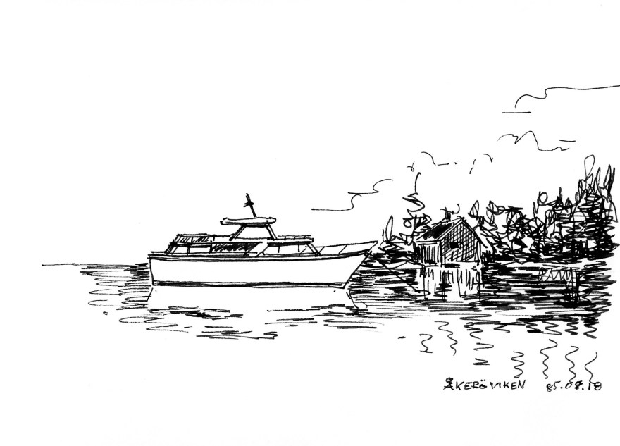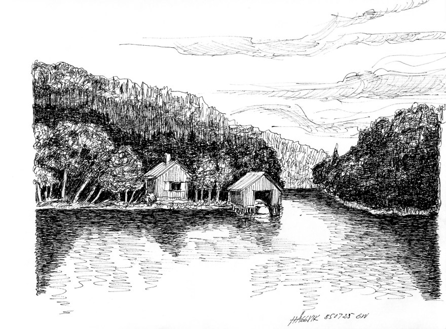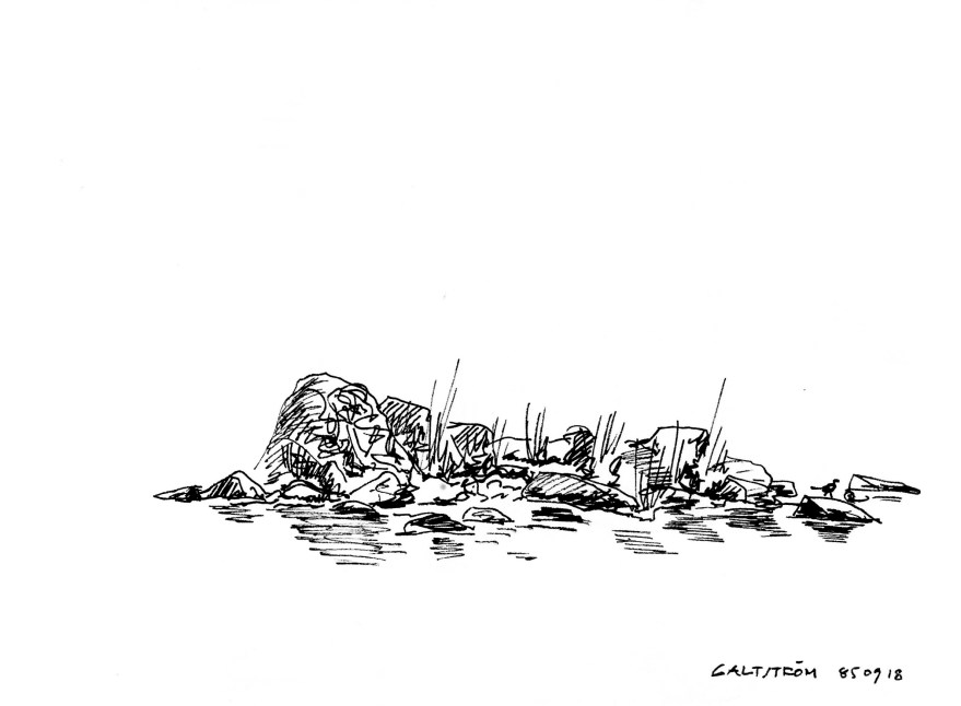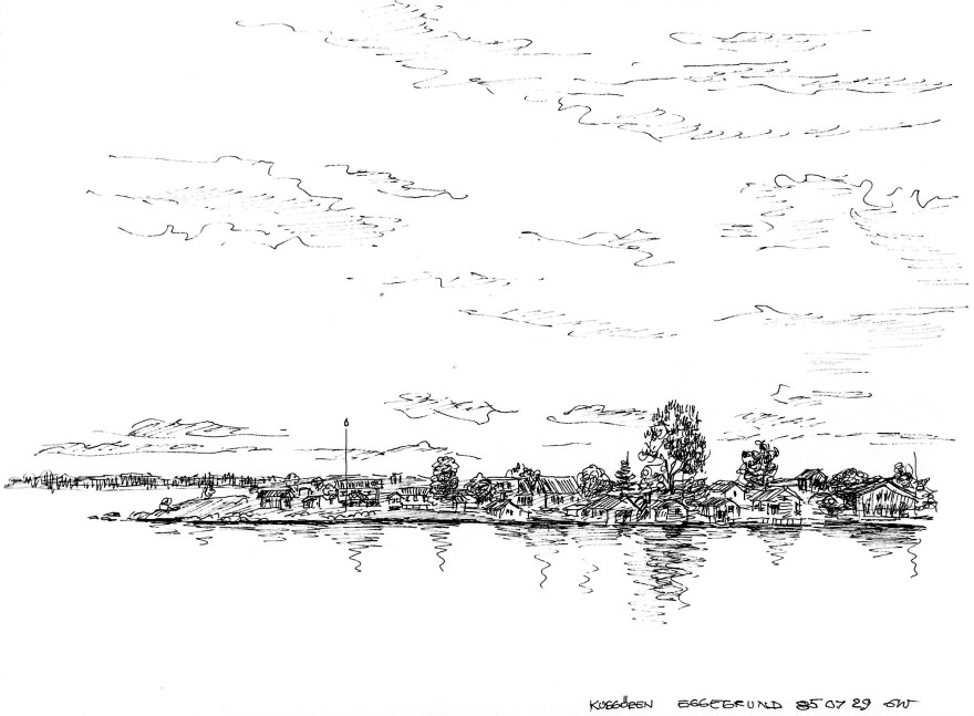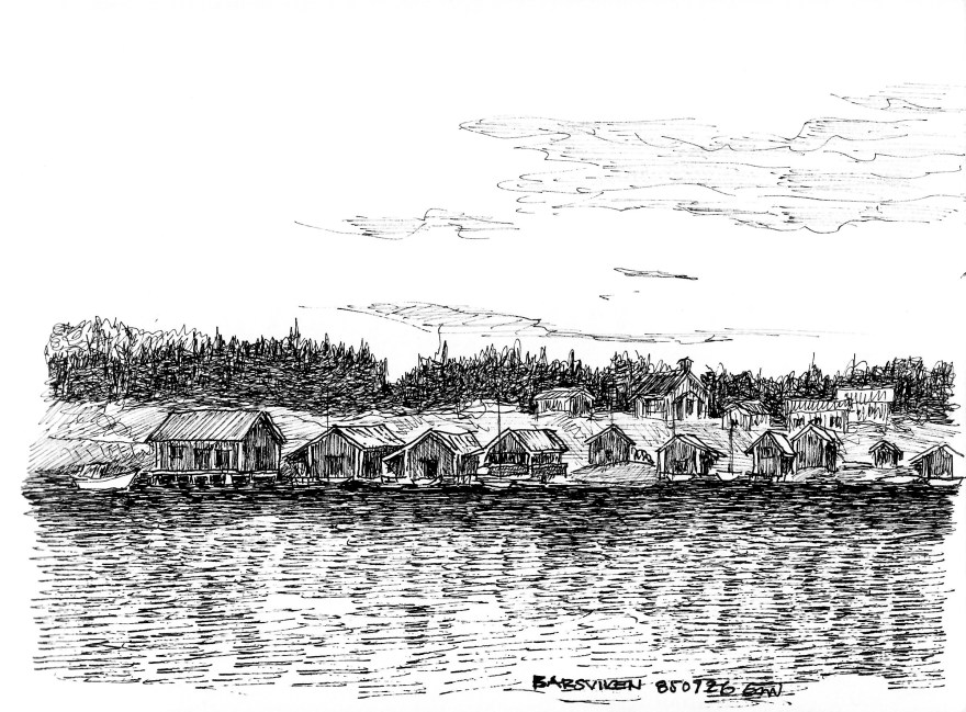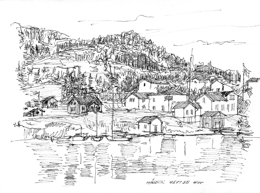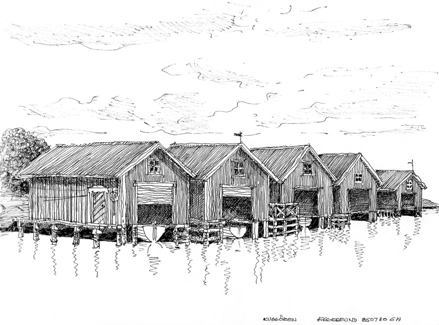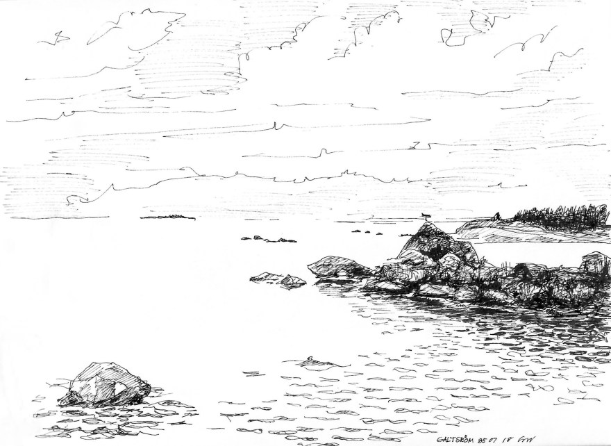 Ur teckningsblocket från båtfärd 1985 utmed Norrlandskusten till Eggegrund. Galtström, Åkeröviken, Häggvik, Barsviken, Kuggören och Eggegrund.