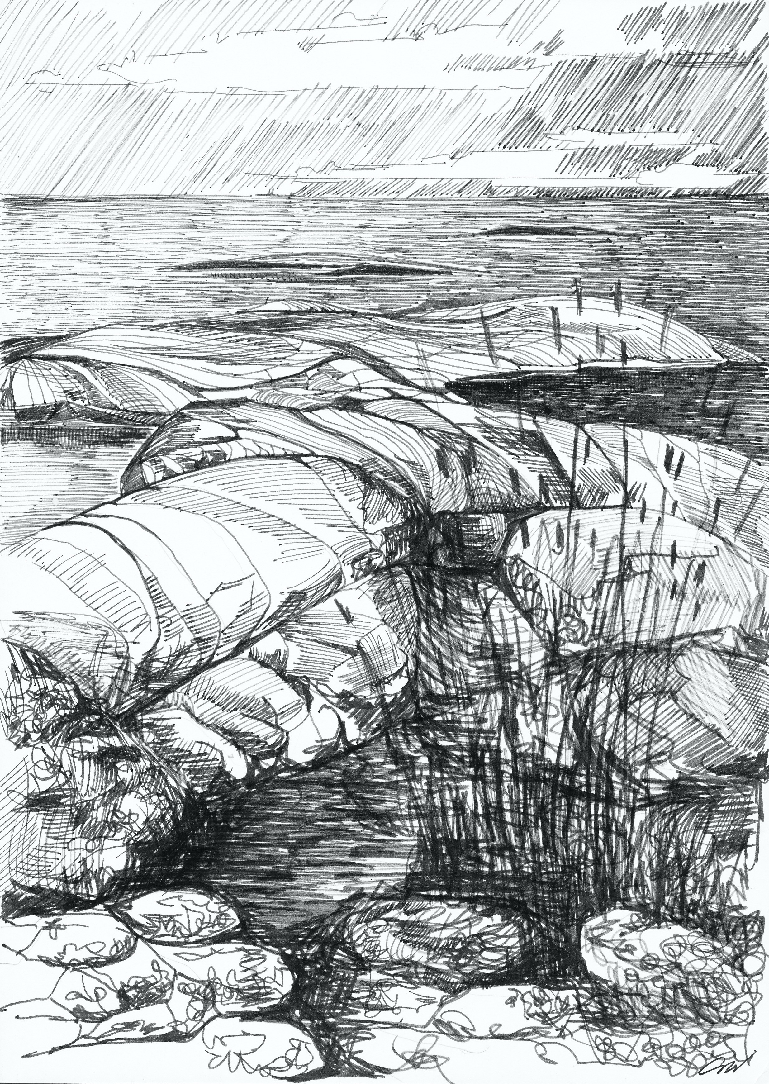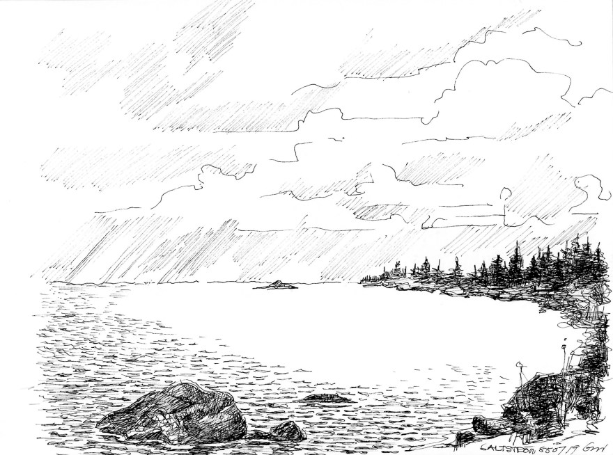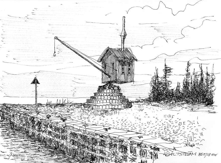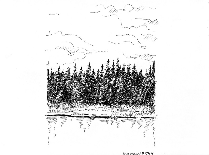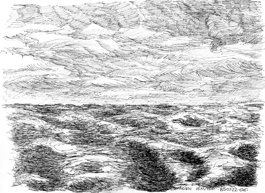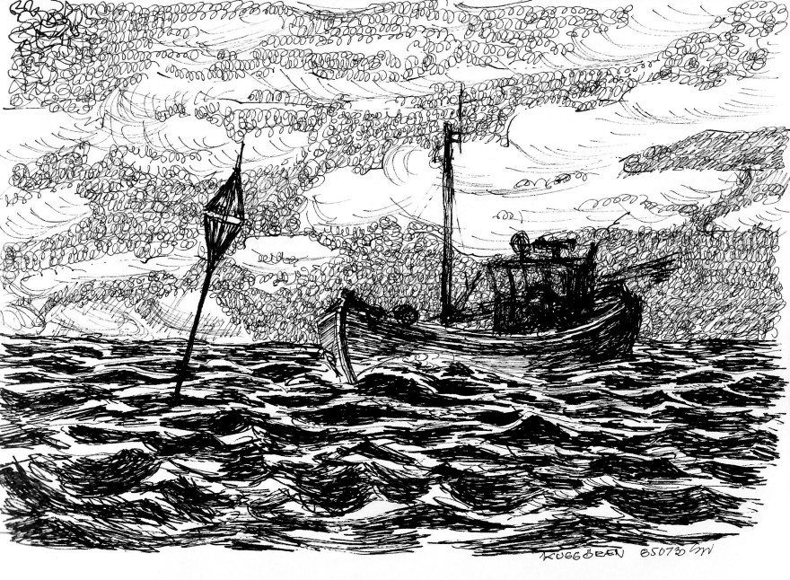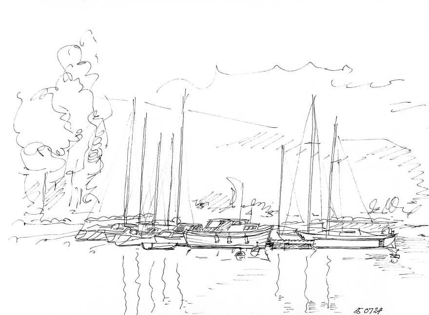 Ur teckningsblocket från båtfärd 1985 utmed Norrlandskusten till Eggegrund. Galtström, Åkeröviken, Häggvik, Barsviken, Kuggören och Eggegrund.